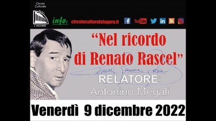 Il Circolo Culturale “L’Agorà” organizza una conversazione sul tema “Nel ricordo di Renato Rascel”. Al secolo Renato Ranucci è uno dei monumenti del teatro leggero italiano. Nella sua lunghissima carriera ha spaziato dall’avanspettacolo alla rivista, dalla commedia musicale, all’intrattenimento televisivo e radiofonico. Nel 1957 Rascel acquisisce notorietà internazionale con la sua canzone Arrivederci Roma, che spinge un produttore cinematografico di Hollywood a proporgli di girare un film al fianco del tenore Mario Lanza. Nasce così The Seven Hills of Rome, girato in esterni a Roma e in interni negli stabilimenti della Titanus, dove Rascel non sfigura al fianco del grande tenore americano e di Marisa Allasio. Il film verrà distribuito in Italia con il titolo Arrivederci Roma. Parteciperà in qualità di relatore Antonino Megali (vice presidente del sodalizio culturale organizzatore). Tenuto conto dei protocolli di sicurezza anti-contagio e dei risultati altalenanti della pandemia di COVID 19 e nel rispetto delle norme del DPCM del 24 ottobre 2020 la conversazione sarà disponibile, sulle varie piattaforme Social Network presenti nella rete, a far data da venerdì 9 dicembre.