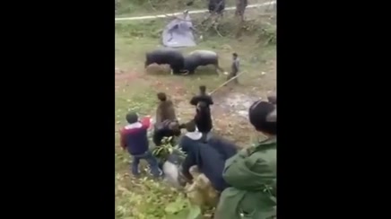 Un uomo rimane incastrato tra le corna di due bufali